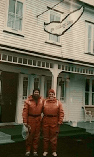 Here we are suited up in exposure suits, ready to go search for humpback whales. We're in front of the Village Inn in Trinity where the tours originated.